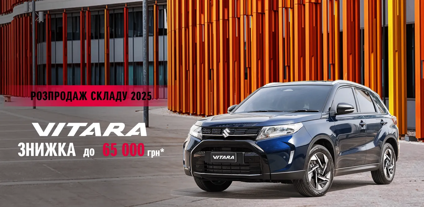 ДП «АВТО Інтернешнл», офіційний дистриб'ютор автомобілів і мототехніки SUZUKI в Україні, оголошує про знижку до 65 000 грн* , яка діє з 19 січня 2026 року до 28 лютого 2026 року на автомобілі SUZUKI VITARA 2025 року виробництва. Кількість автомобілів обмежена – встигніть скористатись вигідною пропозицією.